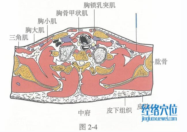 中府,經穴名。出自《素問·離合真邪論》。別名膺中俞、府中俞、膺俞。屬手太陰肺經。位于胸部,橫平第1肋間隙,鎖骨下窩外側,前正中線旁開6寸。當胸大肌、胸小肌處,內側深層為第1肋間內、外肌,上外側有腋動、靜脈,胸肩峰動、靜脈,布有鎖骨上神經中間支,胸前神經分支及第1肋間神經外側皮支。主治咳嗽、氣喘、胸滿痛等肺部病證。向外斜刺或平刺0.5-0.8寸。