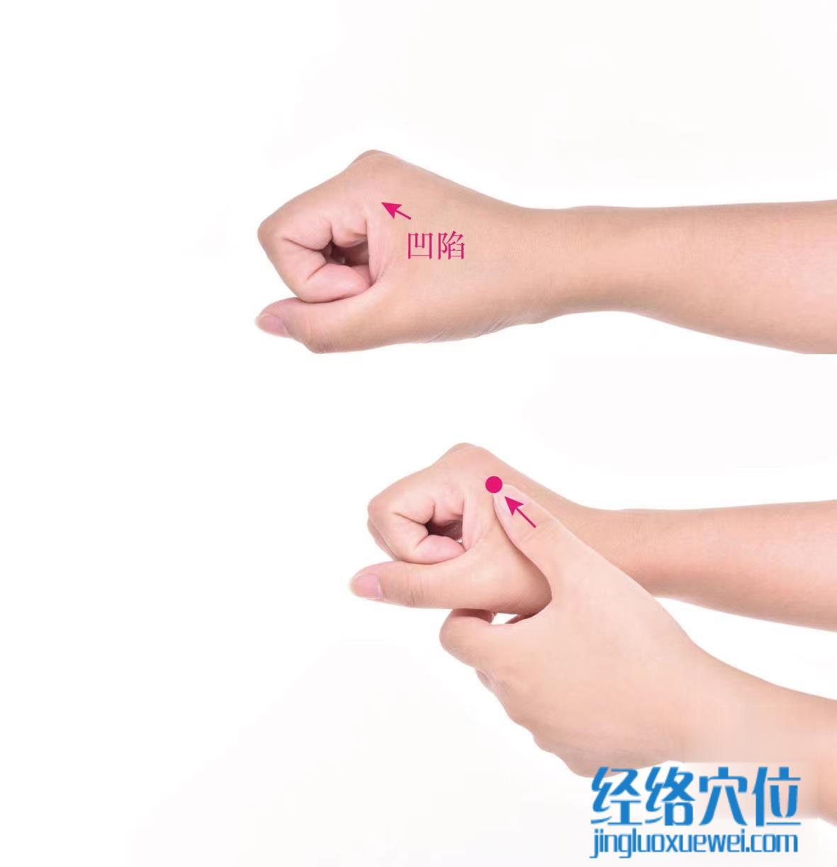 【位置】在手背,第2掌指關(guān)節(jié)橈側(cè)近端凹陷中。