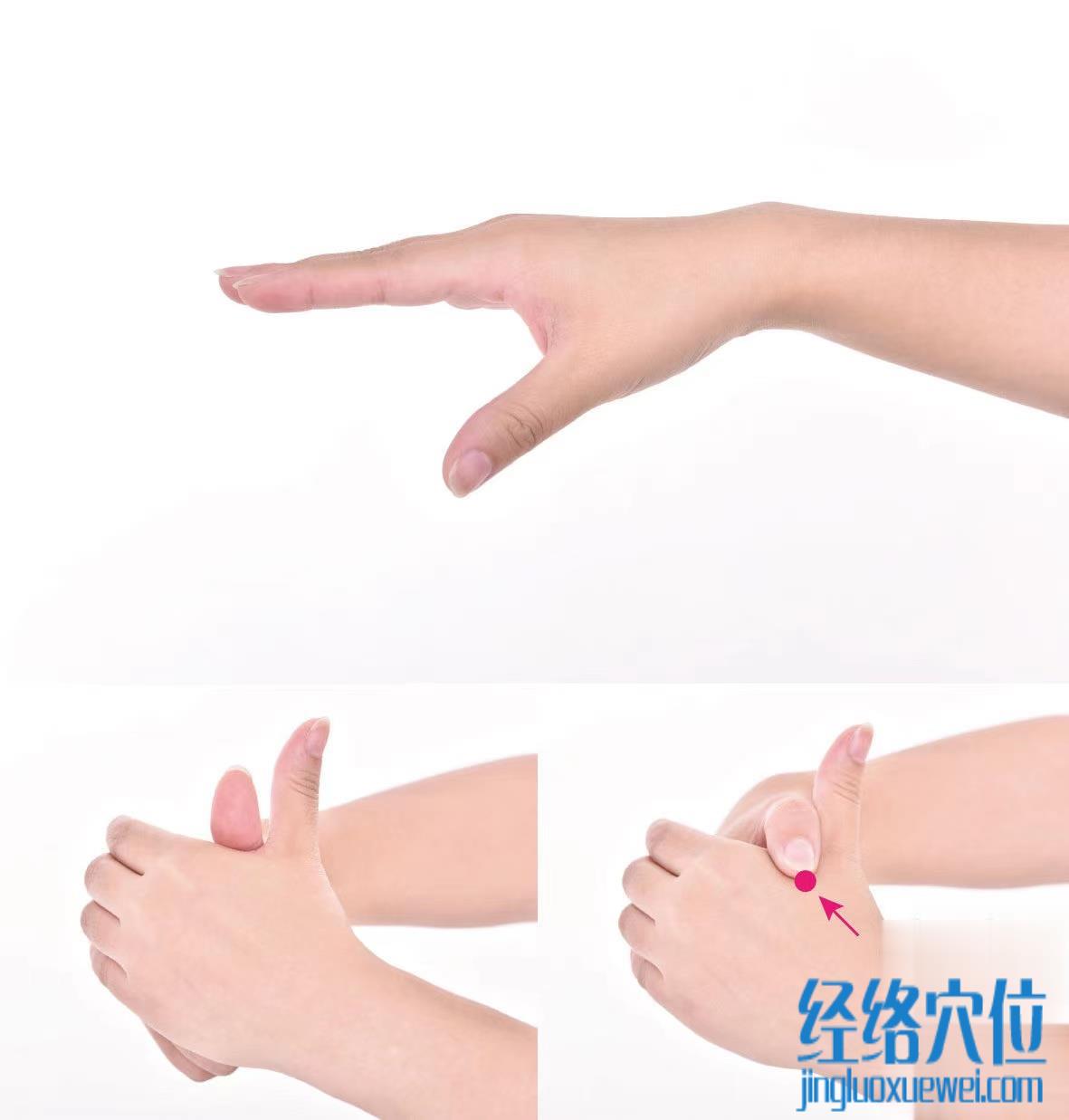 簡(jiǎn)便取穴法:以一手的拇指指間關(guān)節(jié)橫紋,放在另一手拇、食指之間的指蹼緣上,當(dāng)拇指尖下是穴。