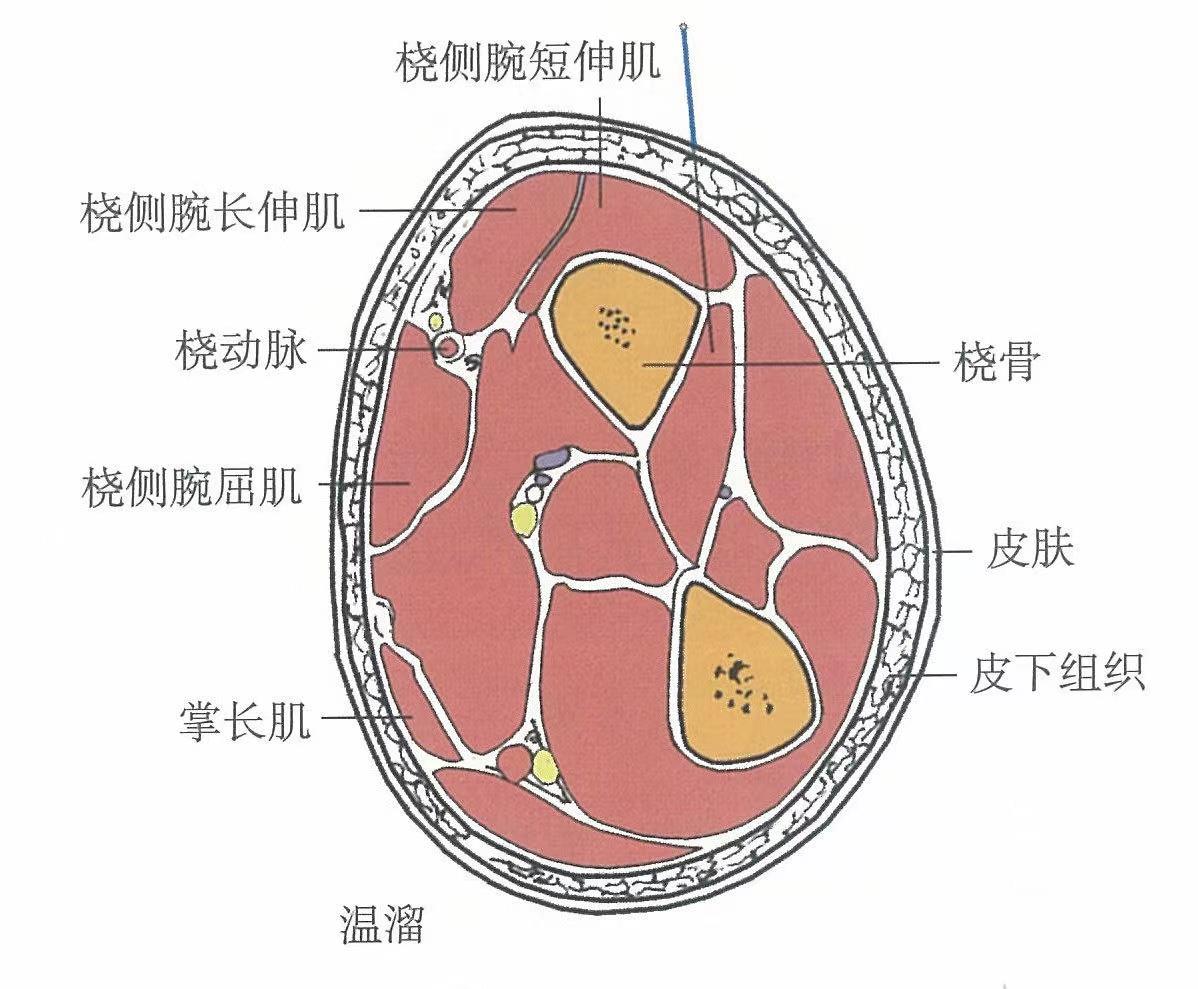 【解剖】皮膚→皮下組織→橈側(cè)腕長伸肌腱→橈側(cè)腕短伸肌。淺層布有頭靜脈,前臂外側(cè)皮神經(jīng)和前臂后皮神經(jīng)。深層在橈側(cè)腕長伸肌和橈側(cè)腕短伸肌腱之前有橈神經(jīng)淺支。