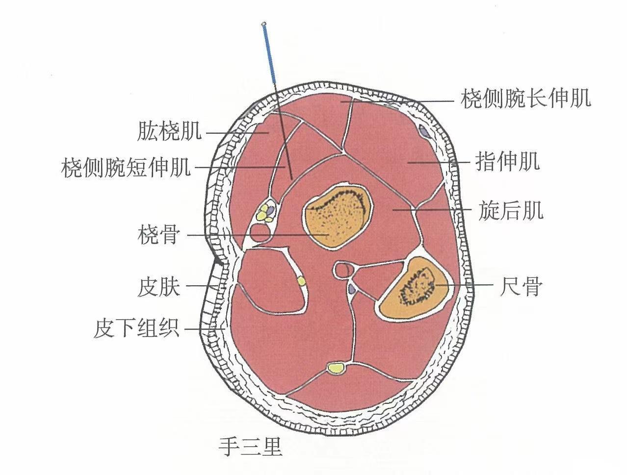 【解剖】皮膚→皮下組織→橈側(cè)腕長伸肌→橈側(cè)腕短伸肌→指伸肌的前方→旋后肌。淺層布有前臂外側(cè)皮神經(jīng)、前臂后皮神經(jīng)。深層有橈側(cè)返動、靜脈的分支或?qū)僦Ъ皹锷窠?jīng)深支。
