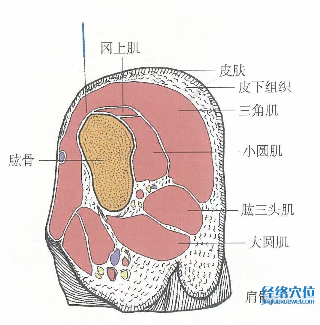 【解剖】有旋肱后動、靜脈;布有鎖骨上神經(jīng)、腋神經(jīng)。