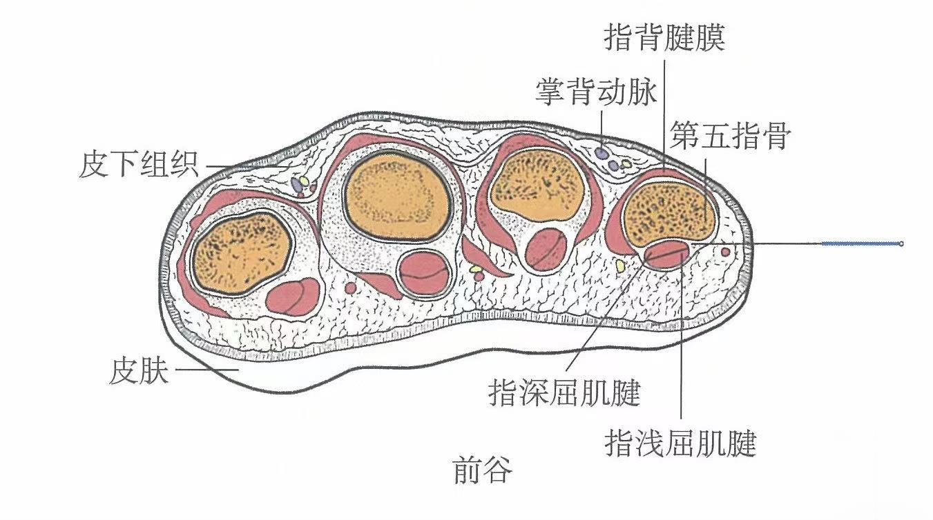 【解剖】皮膚→皮下組織→指甲根。分布有尺神經(jīng)指掌側(cè)固有神經(jīng)的指背支和小指尺掌側(cè)動、靜脈指背支形成的動、靜脈網(wǎng)。
