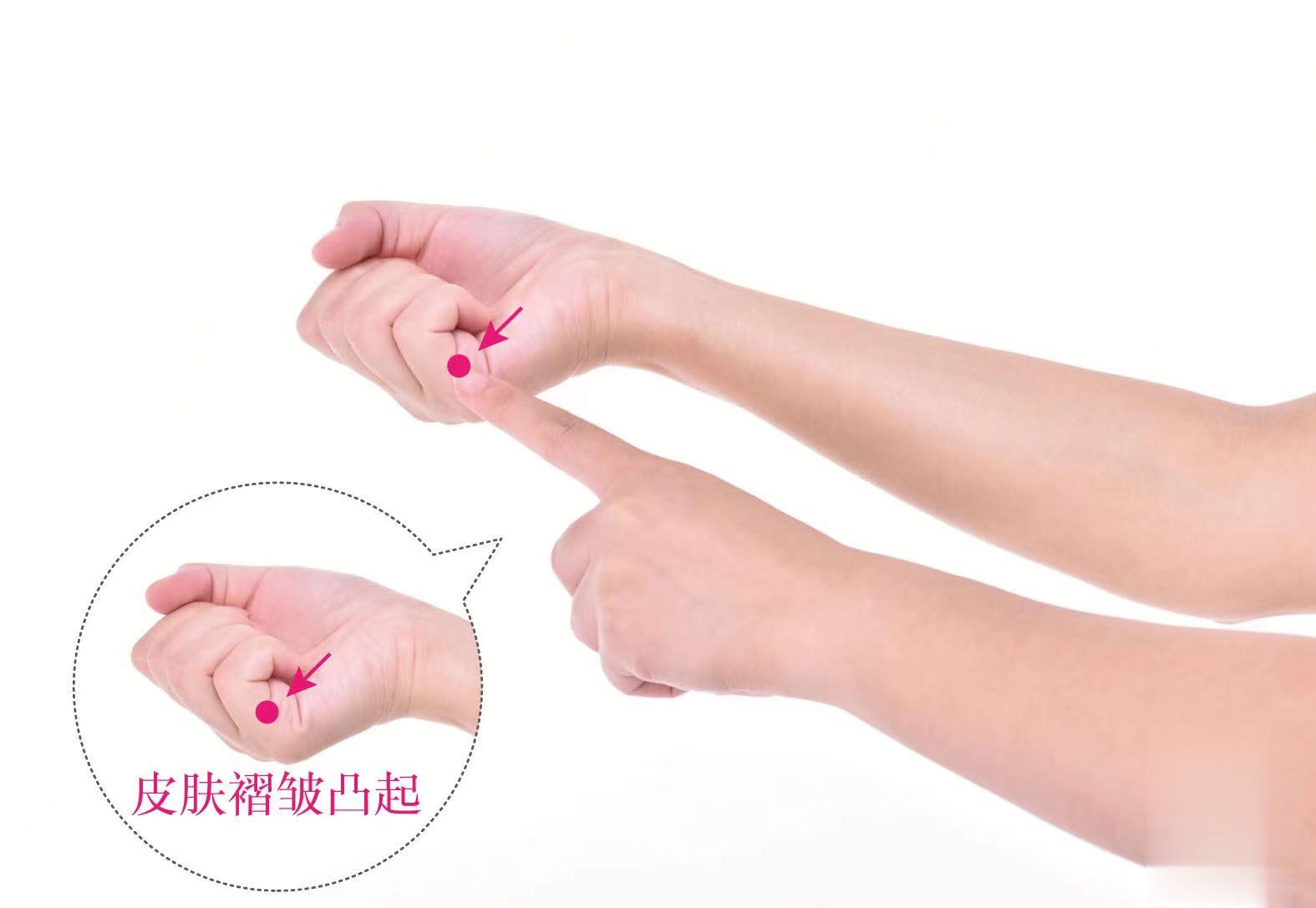 【取穴方法】 伸小指,沿指甲底部與指尺側(cè)引線交點(diǎn)處即是。
