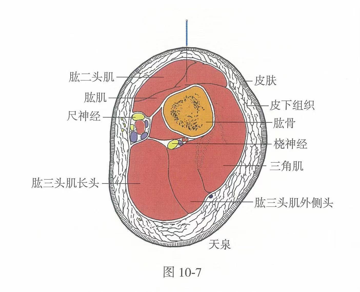 【解剖】在肱二頭肌的長、短頭之間;有肱動、靜脈肌支;布有臂內(nèi)側(cè)皮神經(jīng)及肌皮神經(jīng)。