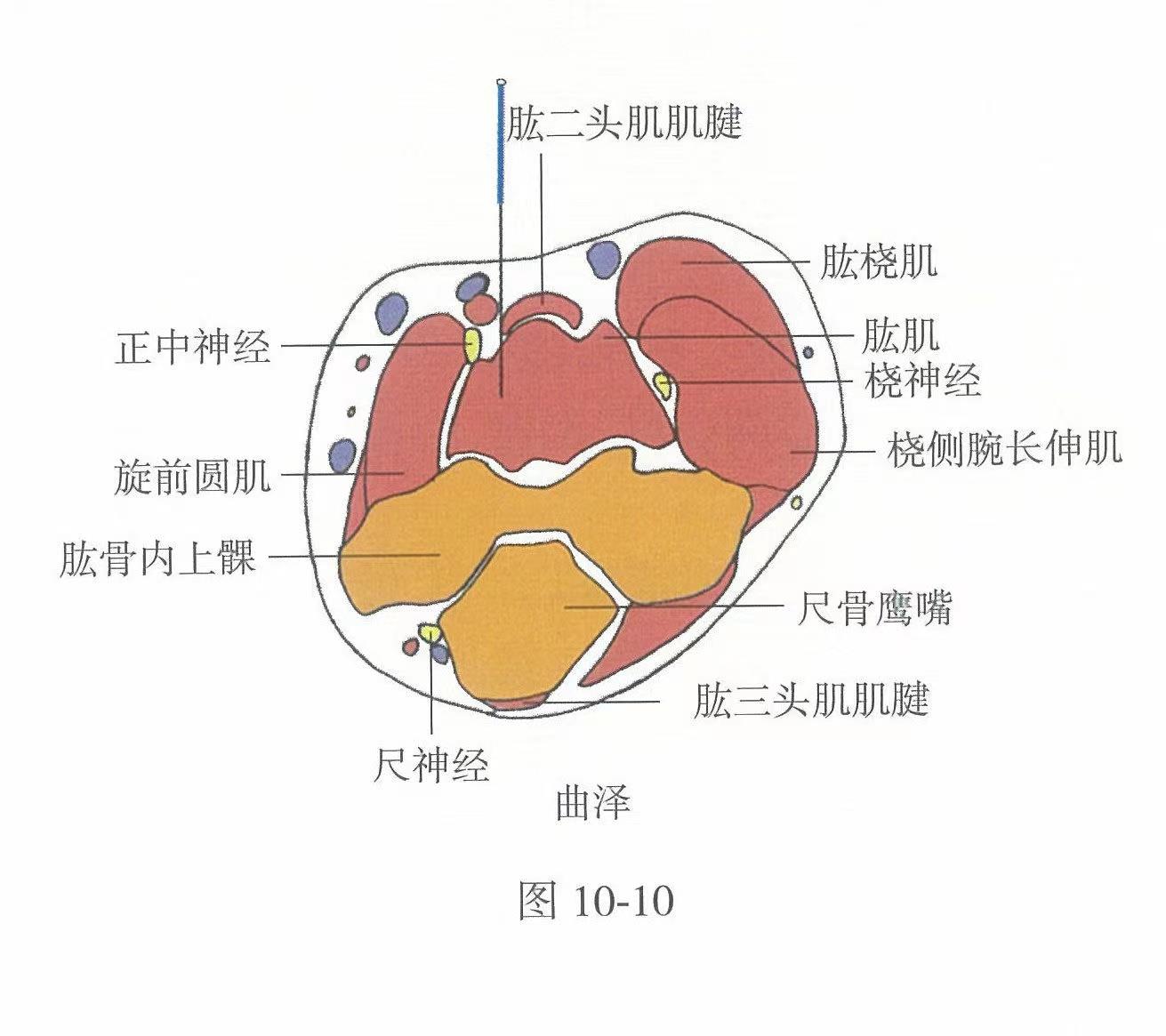 【位置】在肘前區(qū),肘橫紋上,肱二頭肌腱的尺側(cè)緣凹陷中。