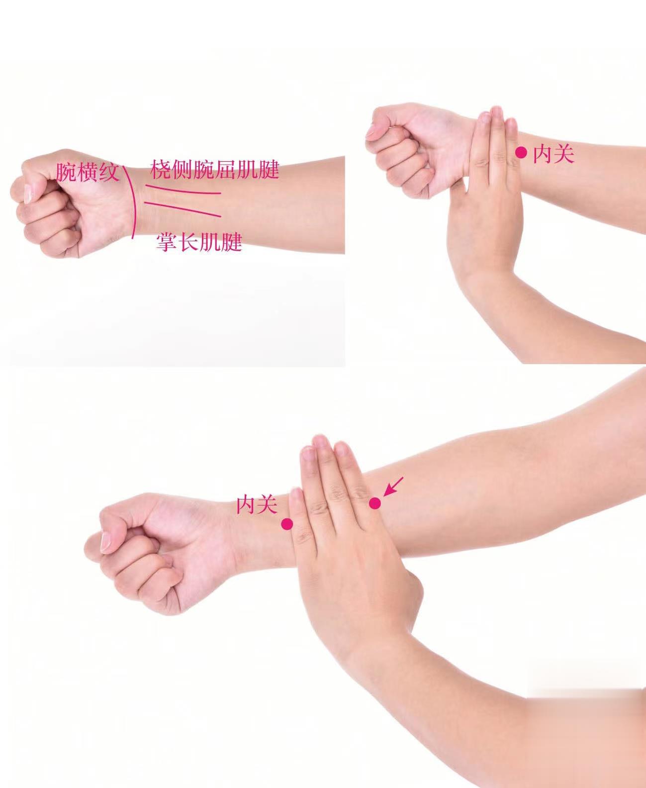 1.微屈腕握拳,從腕橫紋向上量3橫指,兩條索狀筋之間是內(nèi)關(guān)穴,再向上4橫指處。