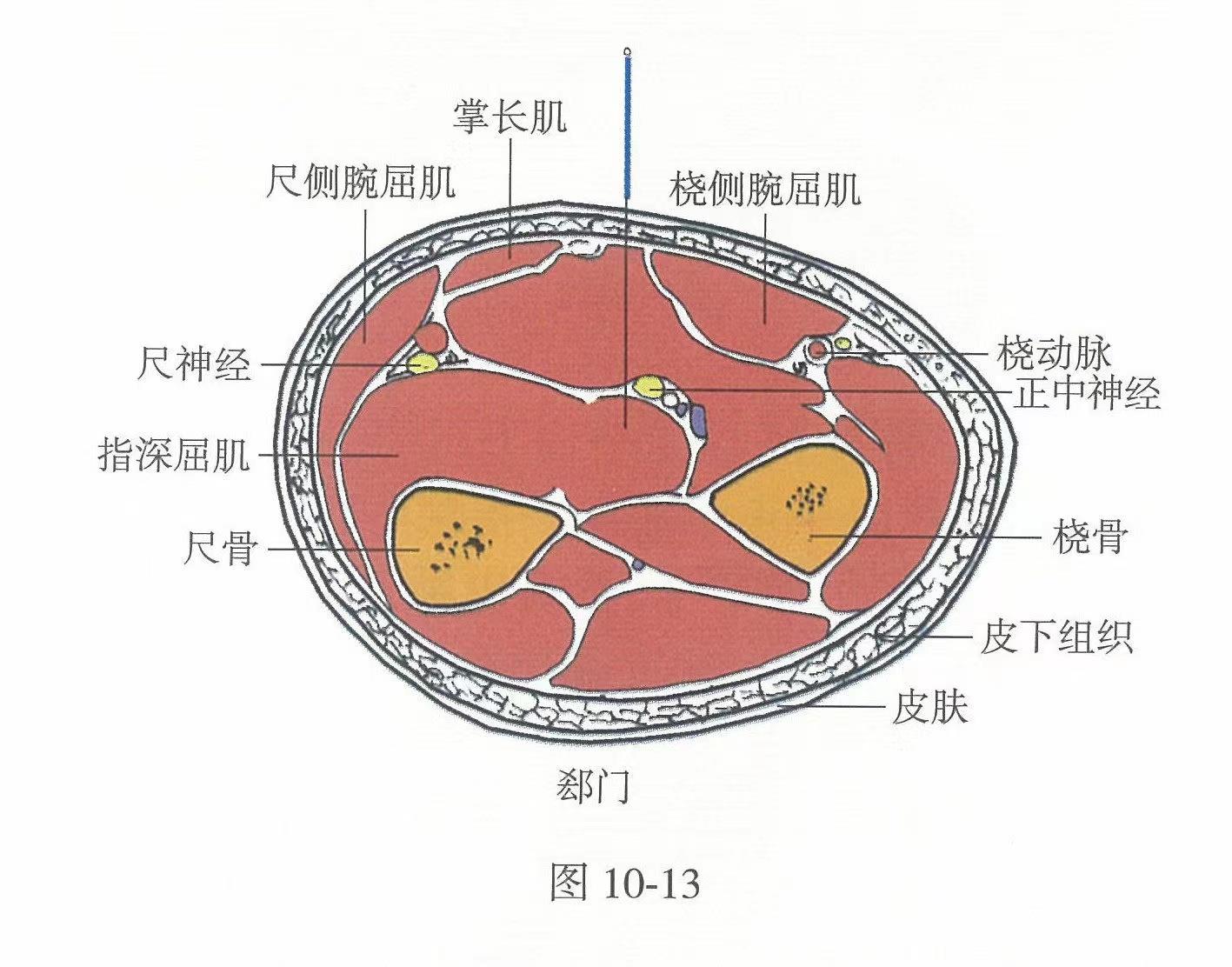 【解剖】在橈側(cè)腕屈肌腱與掌長(zhǎng)肌腱之間,淺部有指淺屈肌,深部為指深屈肌;有前臂正中動(dòng)、靜脈,深部為前臂掌側(cè)骨間動(dòng)、靜脈;布有前臂內(nèi)側(cè)皮神經(jīng),其下為正中神經(jīng),深層有前臂掌側(cè)骨間神經(jīng)。