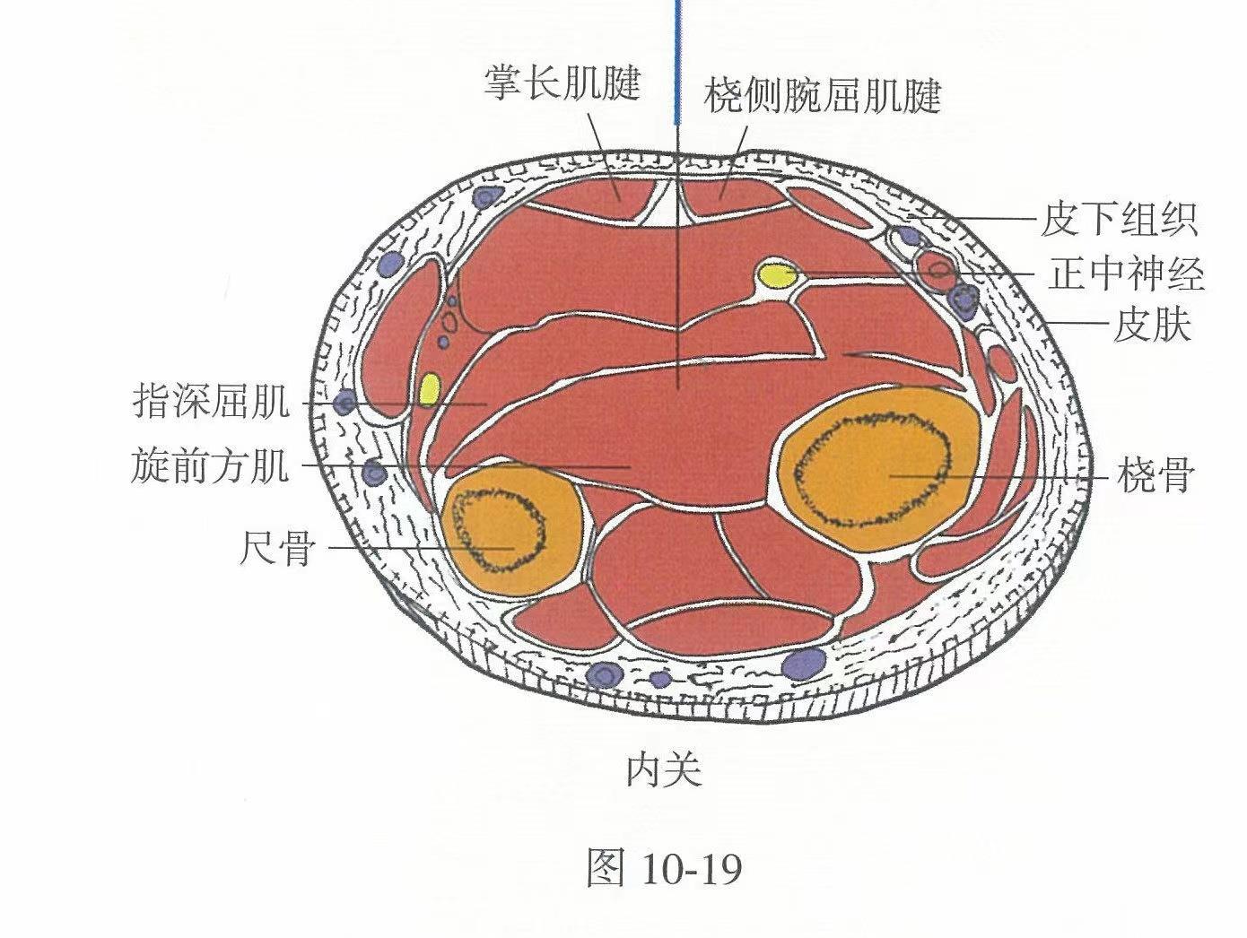 【解剖】在橈側(cè)腕屈肌腱與掌長(zhǎng)肌腱之間,淺部有指淺屈肌,深部為指深屈肌;有前臂正中動(dòng)、靜脈,深部為前臂掌側(cè)骨間動(dòng)、靜脈;布有前臂內(nèi)側(cè)皮神經(jīng),其下為正中神經(jīng),深層有前臂掌側(cè)骨間神經(jīng)。