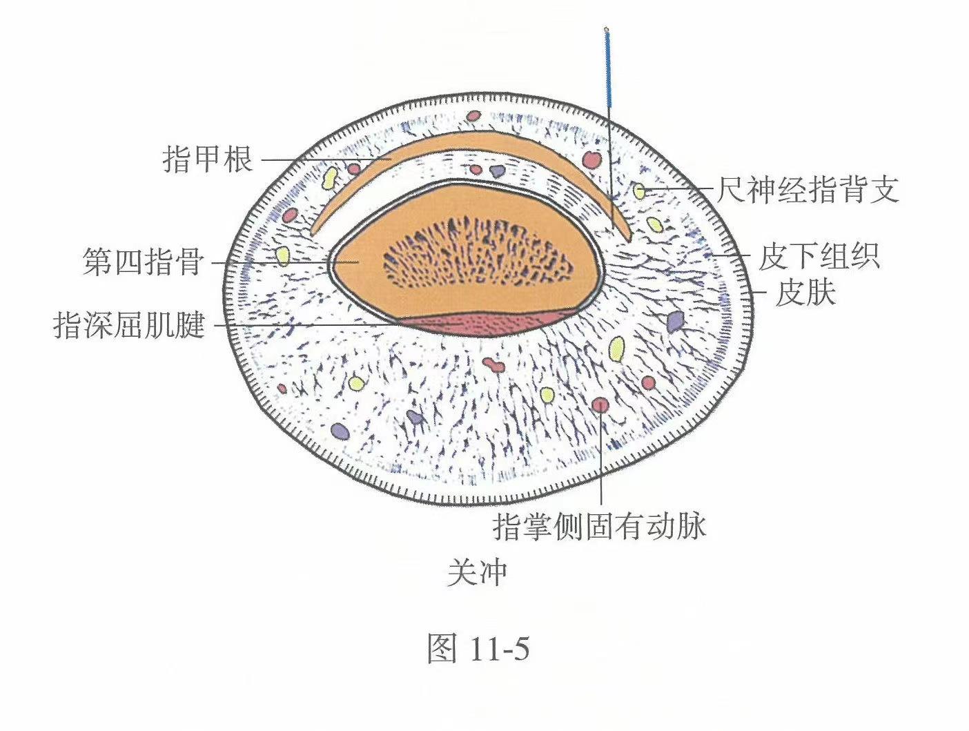 【解剖】皮膚→皮下組織→指甲根。皮下組織內(nèi)有尺神經(jīng)指掌側(cè)固有神經(jīng)的指背支的分支,指掌側(cè)固有動(dòng)、靜脈指背支的動(dòng)、靜脈網(wǎng)。