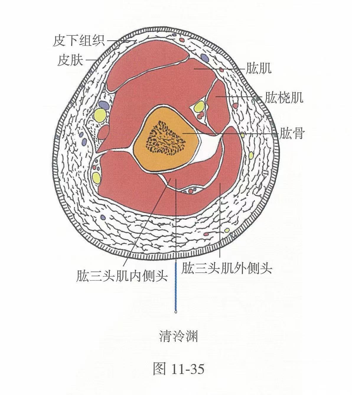 清冷淵配肩髃、曲池,有行氣通絡(luò)的作用,主治肩臂痛。