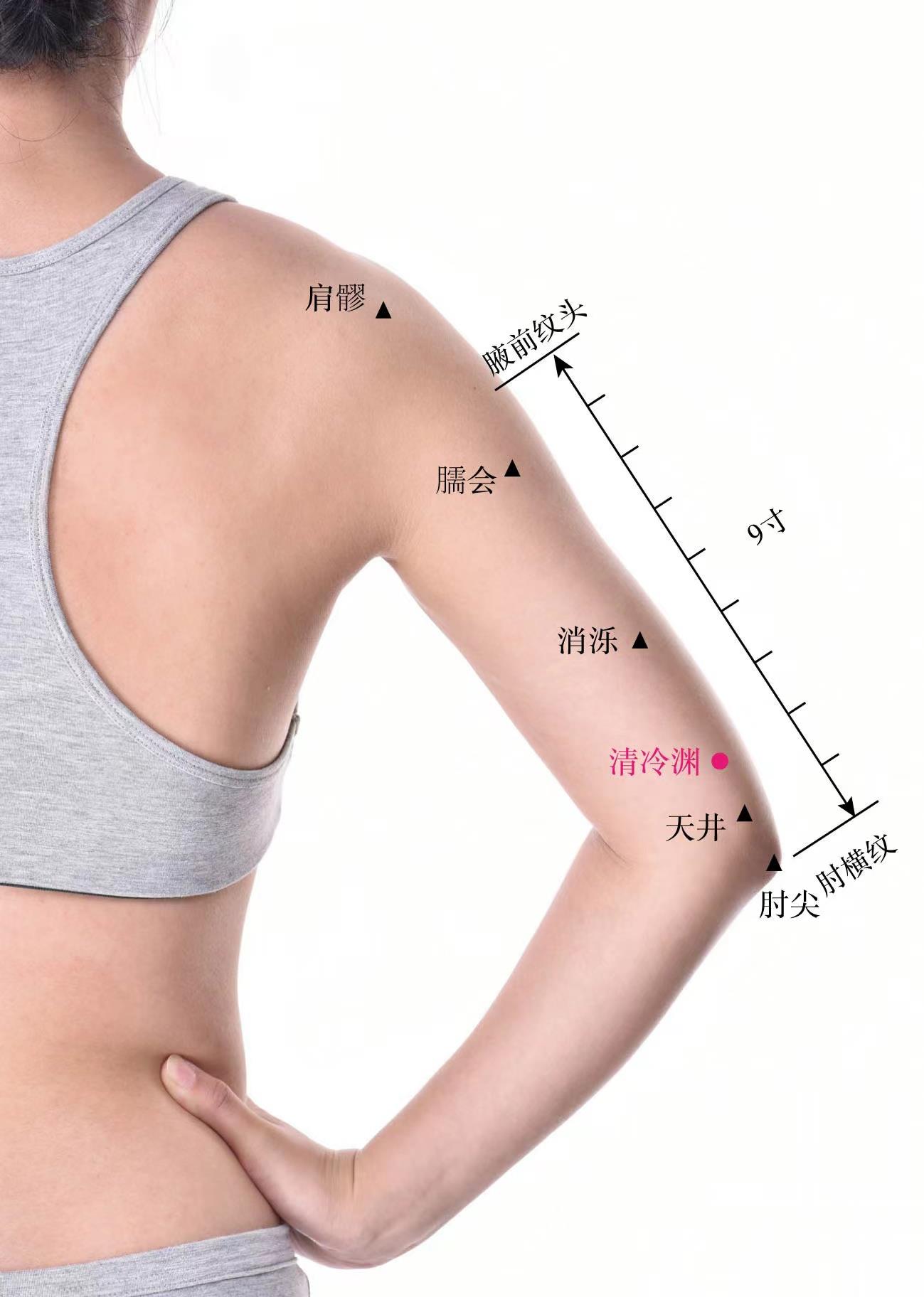 【位置】肘尖與肩峰角連線上,肘尖上2寸