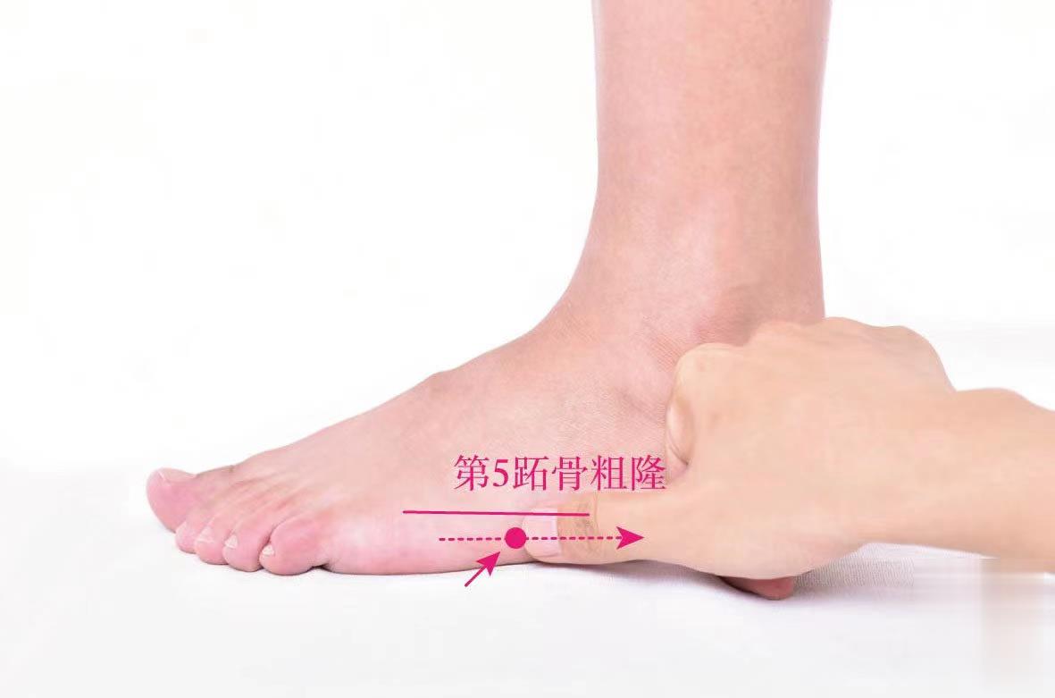 【位置】第5跖骨粗隆前下方,赤白肉際處。