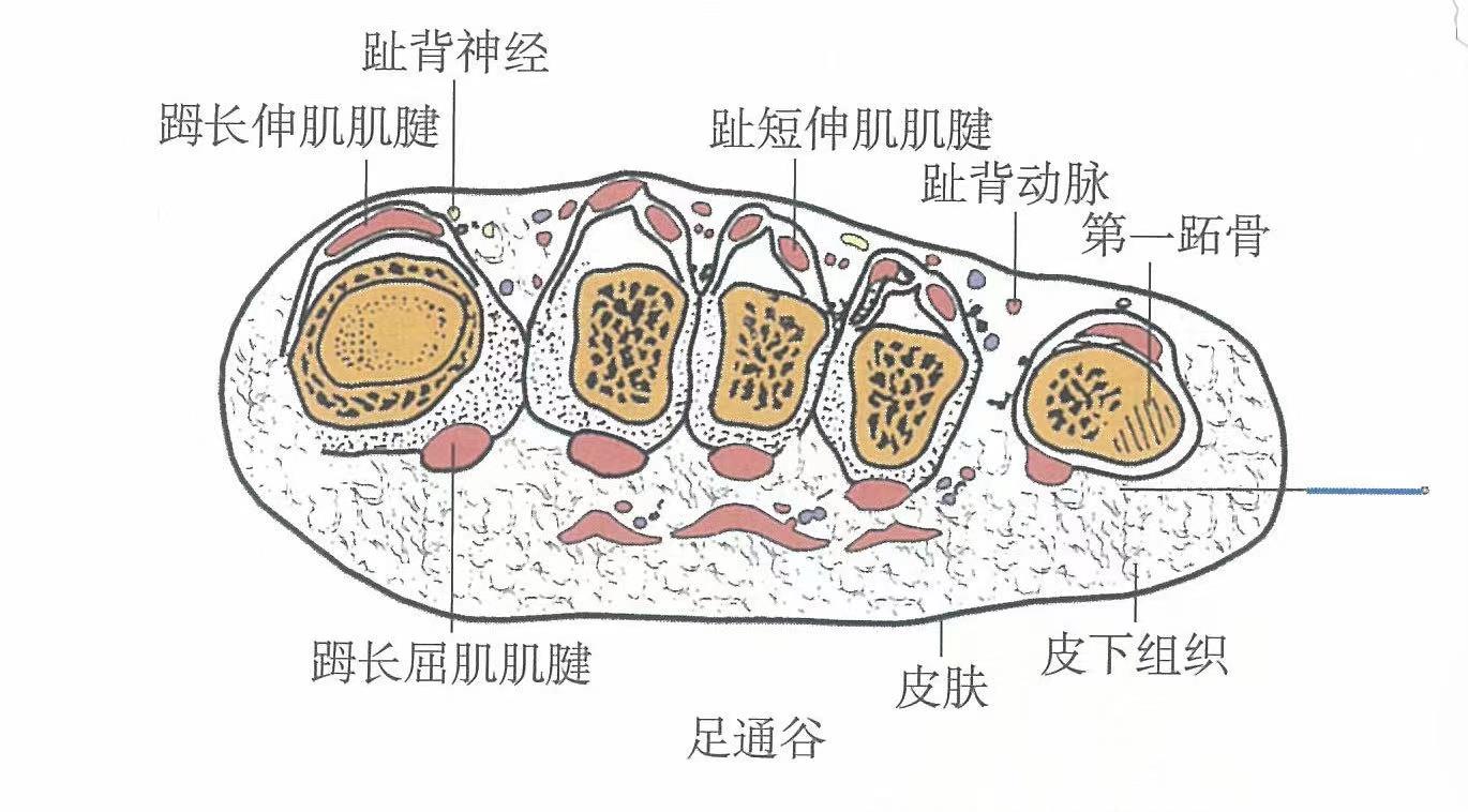 【解剖】有趾跖側(cè)動、靜脈;布有趾跖側(cè)固有神經(jīng)及足背外側(cè)皮神經(jīng)。