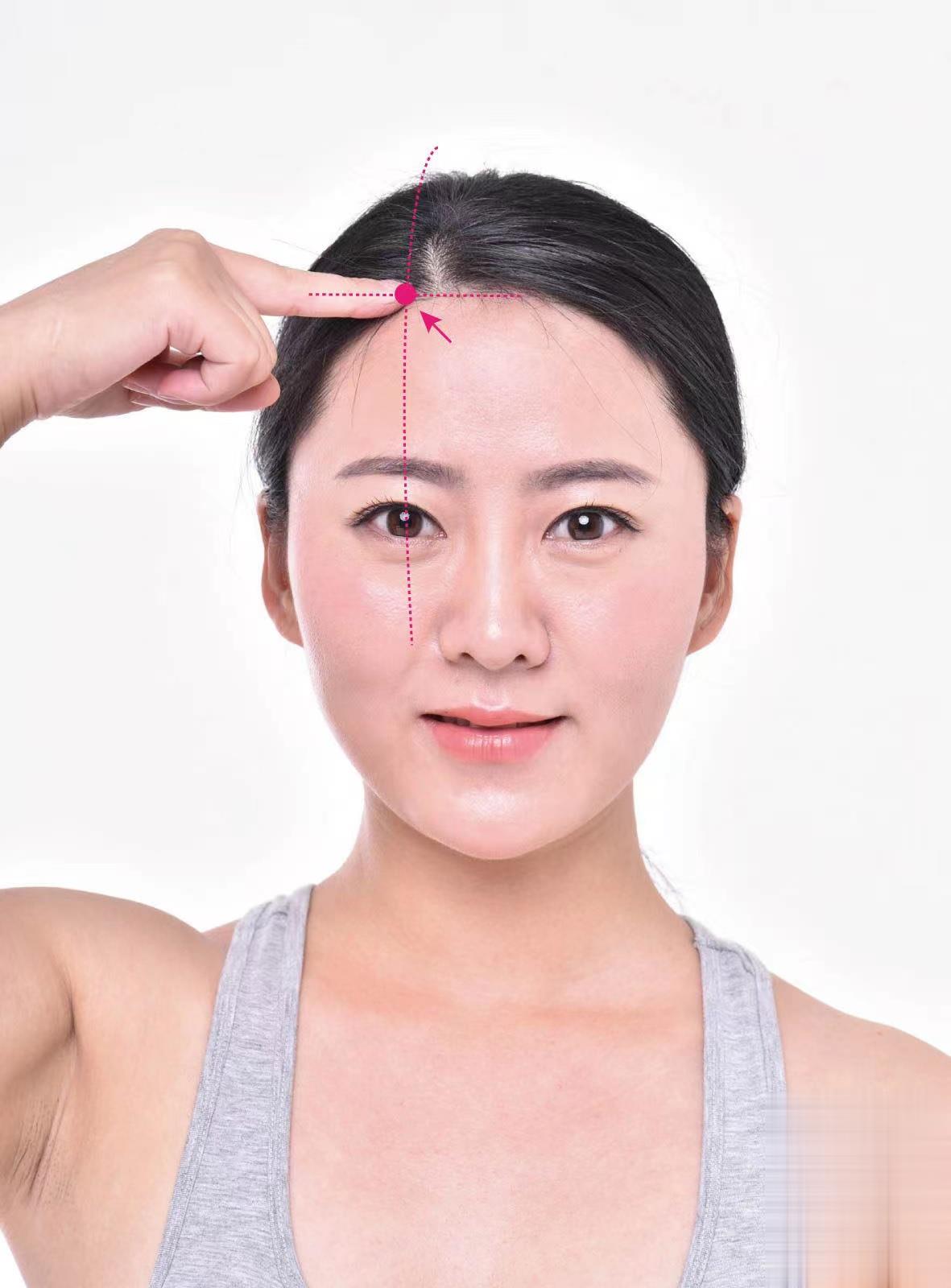 第2步:自瞳孔直上,入前發(fā)際量半橫指 (大拇指指間關(guān)節(jié)部位的橫徑為1寸)處,即為本穴