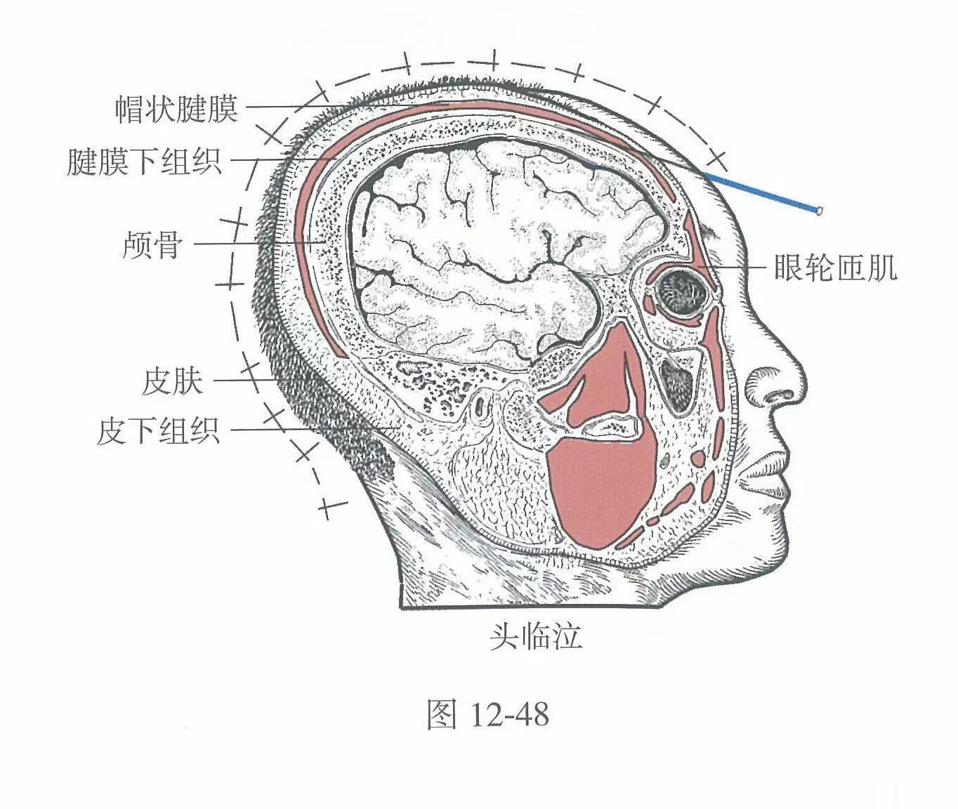 【解剖】皮膚→皮下組織→帽狀腱膜→腱膜下疏松結(jié)締組織。布有眶上神經(jīng)和眶上動、靜脈。