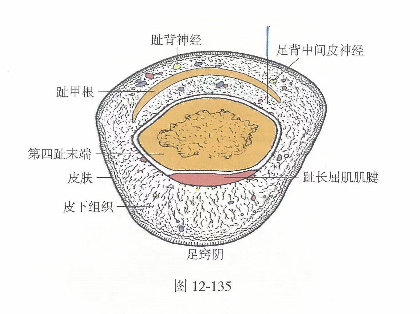 【解剖】皮膚→皮下組織→甲根。布有足背中間皮神經(jīng)的趾背神經(jīng),趾背動、靜脈和趾底固有動、靜脈構(gòu)成的動、靜脈網(wǎng)。