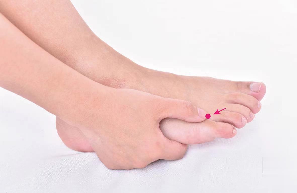俠溪穴位于人體的足背外側(cè),當(dāng)?shù)?、5趾間,趾蹼緣后方赤白肉際處。