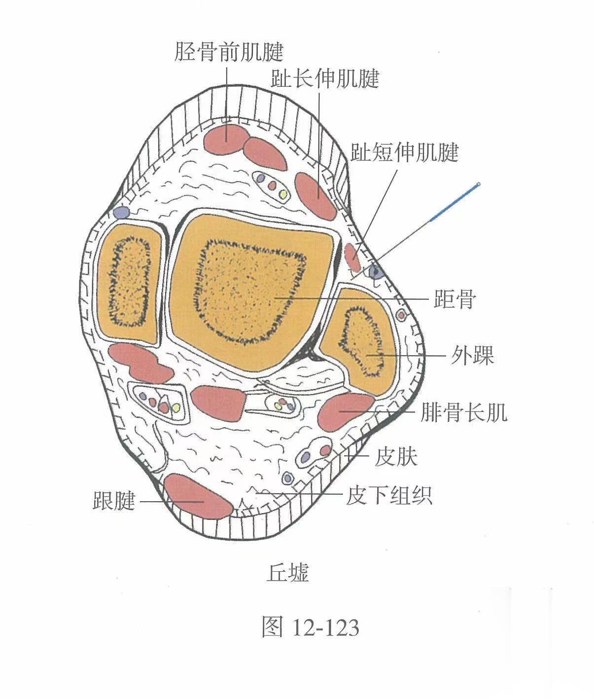 【解剖】在趾短伸肌起點(diǎn)處;有外踝前動(dòng)、靜脈分支;布有足背外側(cè)皮神經(jīng)分支及腓淺神經(jīng)分支。