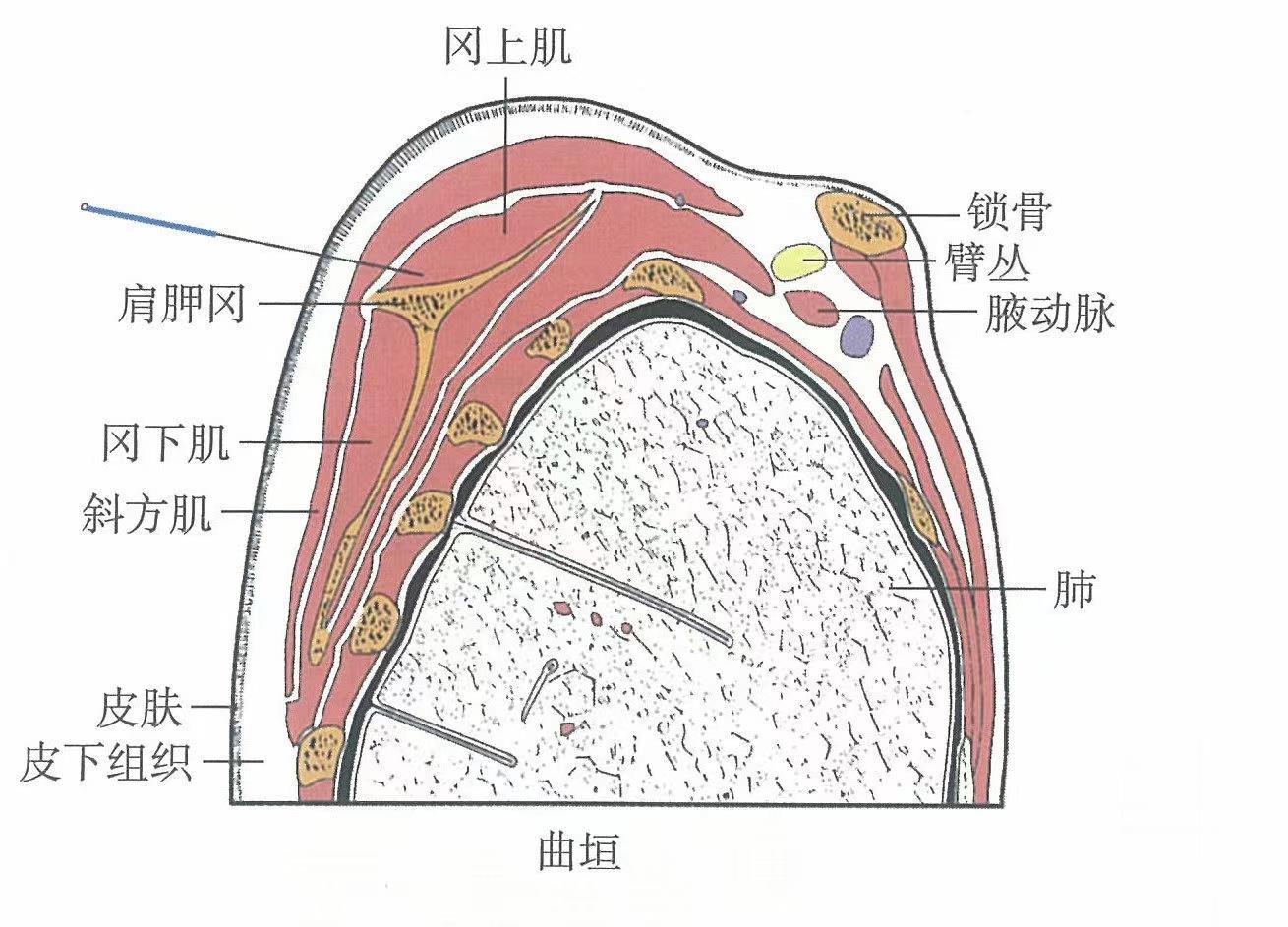 【解剖】在肩胛岡上緣,斜方肌和岡上肌中;有頸橫動、靜脈降支,深層為肩胛上動、靜脈肌支;布有第2胸神經(jīng)后支外側(cè)皮支、副神經(jīng),深層為肩胛上神經(jīng)肌支。