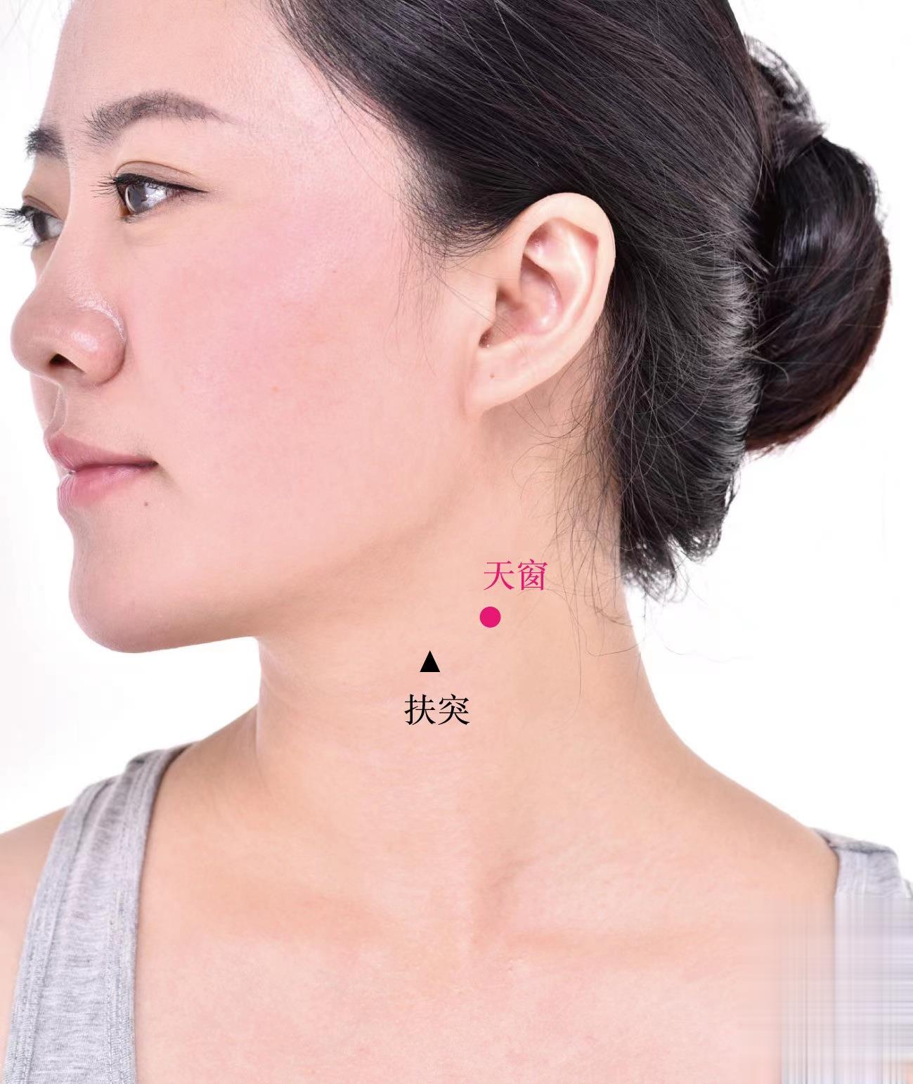 天窗穴配天容穴、少商穴,有清熱利咽的作用,主治咽喉腫痛,扁桃體炎。