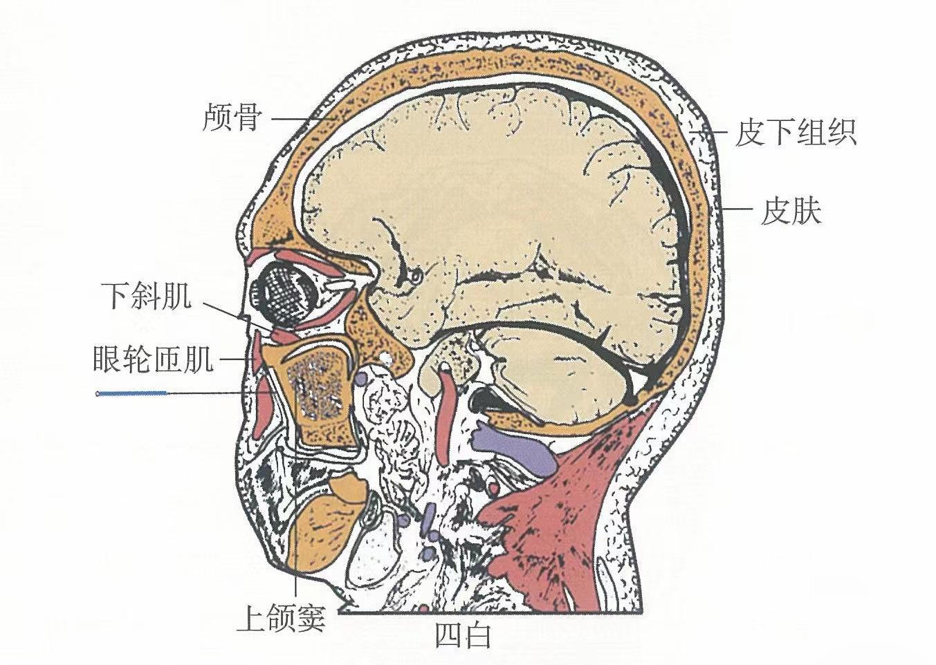 【解剖】皮膚→皮下組織→眼輪匝肌、提上唇肌→眶下孔或上頜骨。淺層布有眶下神經(jīng)的分支,面神經(jīng)的顴支。深層在眶下孔內(nèi)有眶下動(dòng)、靜脈和神經(jīng)穿出。