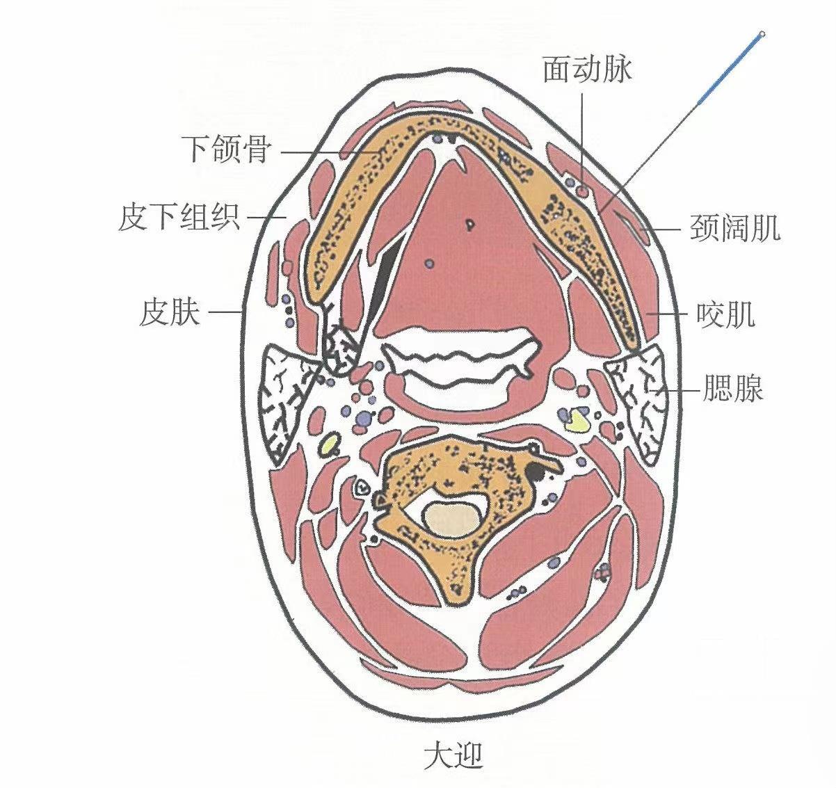 大迎穴配地倉穴、頰車穴,治口、齒痛、面腫。