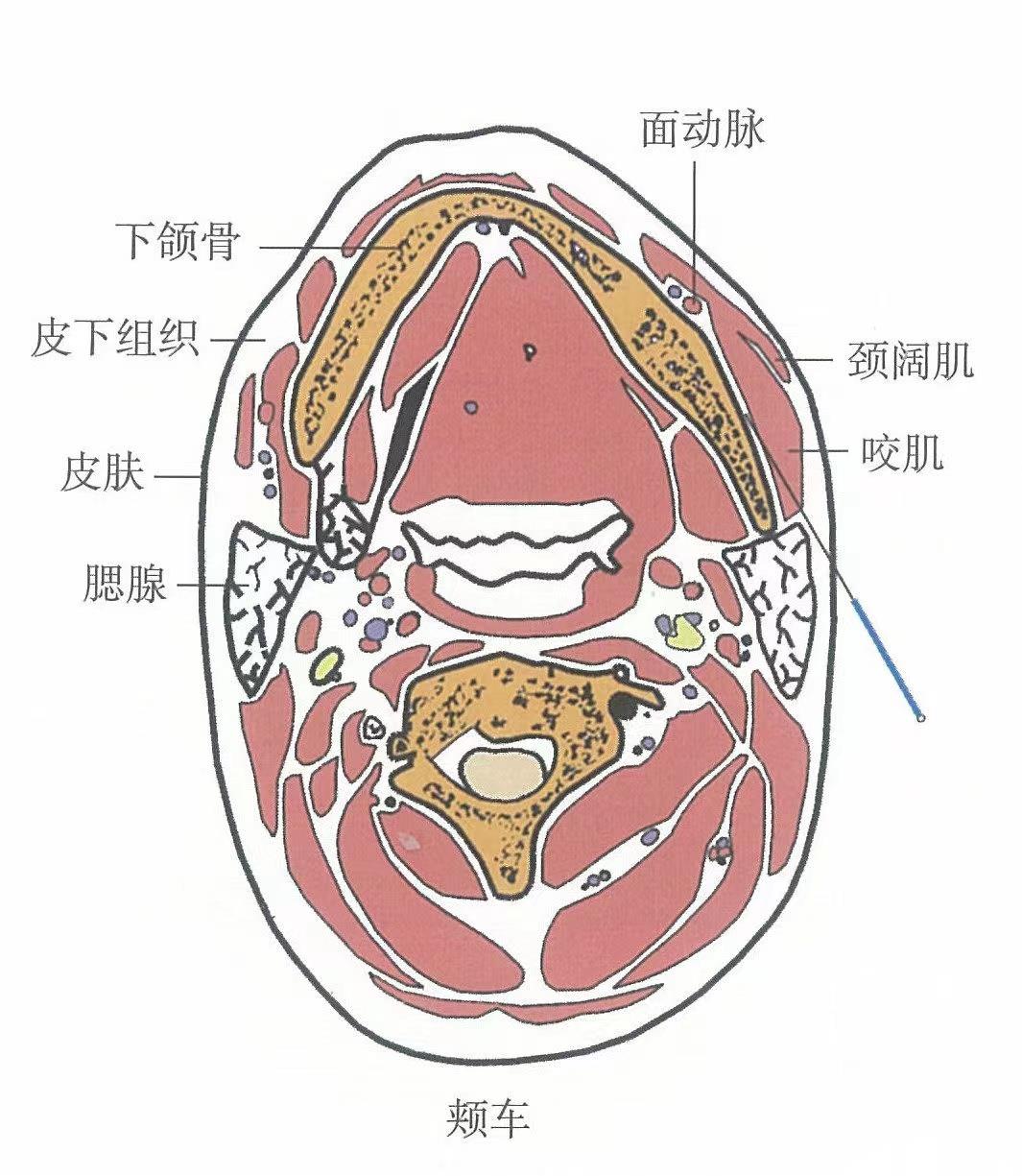 【解剖】皮膚→皮下組織→腮腺→咬肌與顳骨顴突之間→翼外肌。淺層布有耳顳神經(jīng)的分支,面神經(jīng)的顴支,面橫動、靜脈等。深層有上頜動、靜脈,舌神經(jīng),下牙槽神經(jīng),腦膜中動脈和翼叢等