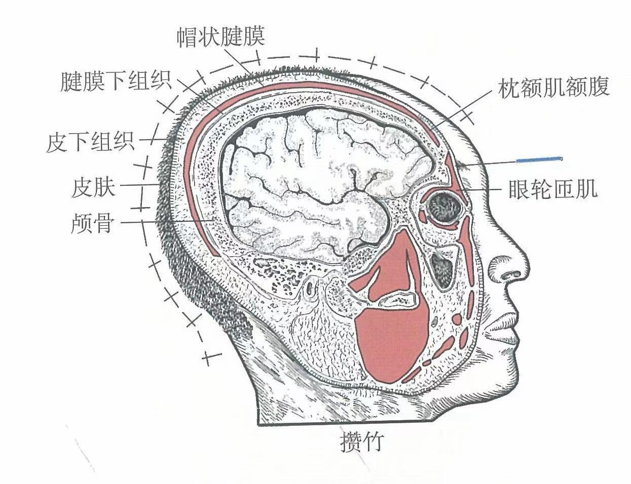 【解剖】有額肌及皺眉肌;當(dāng)額動(dòng)、靜脈處;布有額神經(jīng)內(nèi)側(cè)支。