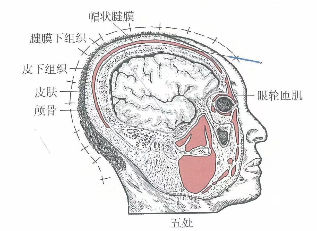 【解剖】皮膚→皮下組織→枕額肌額腹。淺層布有滑車(chē)上神經(jīng)和滑車(chē)上動(dòng)、靜脈。深層有腱膜下疏松組織和顱骨外膜。
