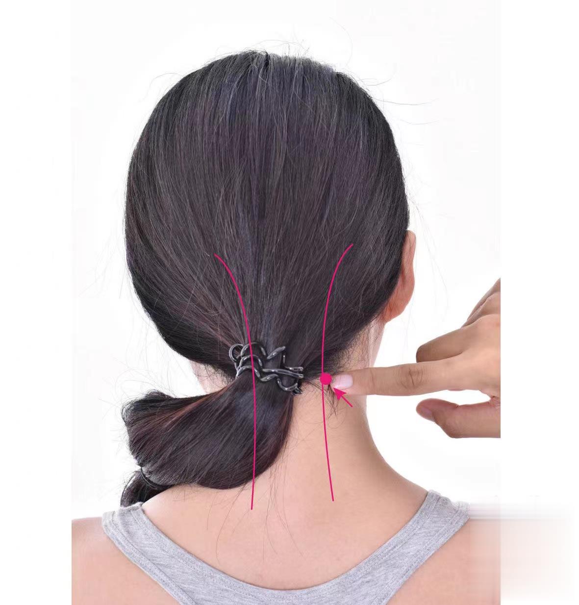 按摩手法: 先把兩手掌互相搓兩三分鐘,搓熱之后,兩手五指在腦后交叉,用兩掌心分別去捂后頸部的左右兩個天柱穴。每次捂 3-5分鐘,重復 5 次以上。