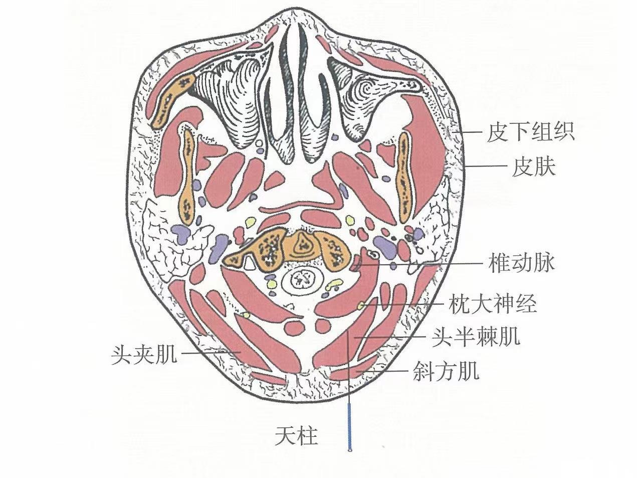 【解剖】皮膚→皮下組織→斜方肌→頭夾肌的內側頭→半棘肌。淺層有第3頸神經后支的內側支和皮下靜脈。深層有枕大神經。