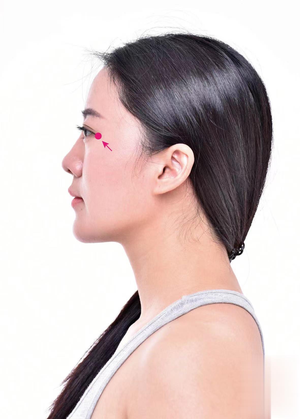 第2步:在外眼角旁約1厘米,眼角紋頭盡處,即為本穴。