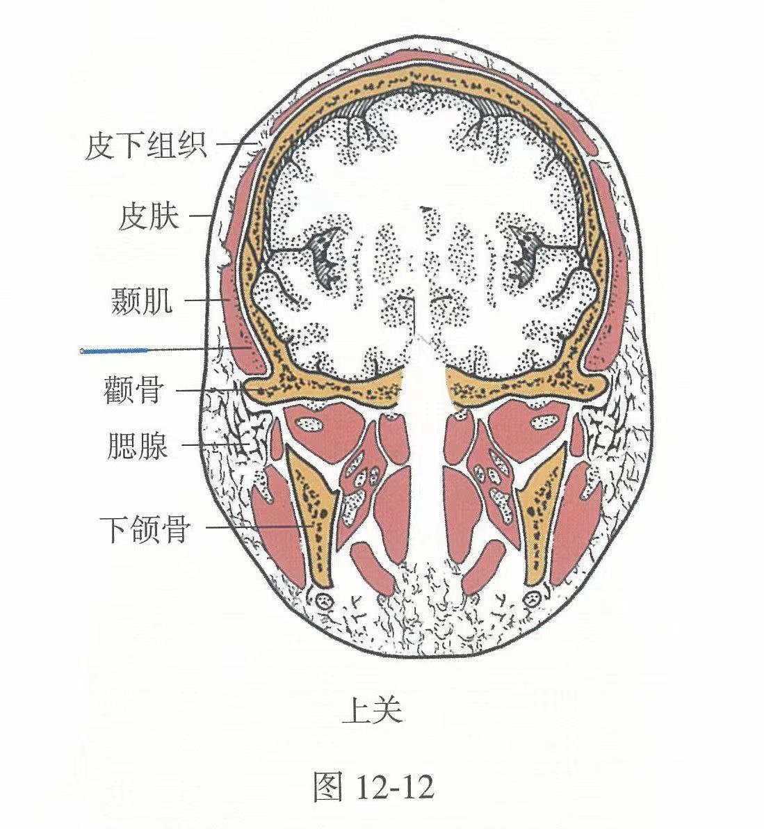 【解剖】皮膚→皮下組織→顳淺筋膜→顳深筋膜→顳筋膜下疏松結(jié)締組織→顳肌。淺層布有耳顳神經(jīng),面神經(jīng)顳支和顳淺動、靜脈。深層有顳深前、后神經(jīng)的分支。