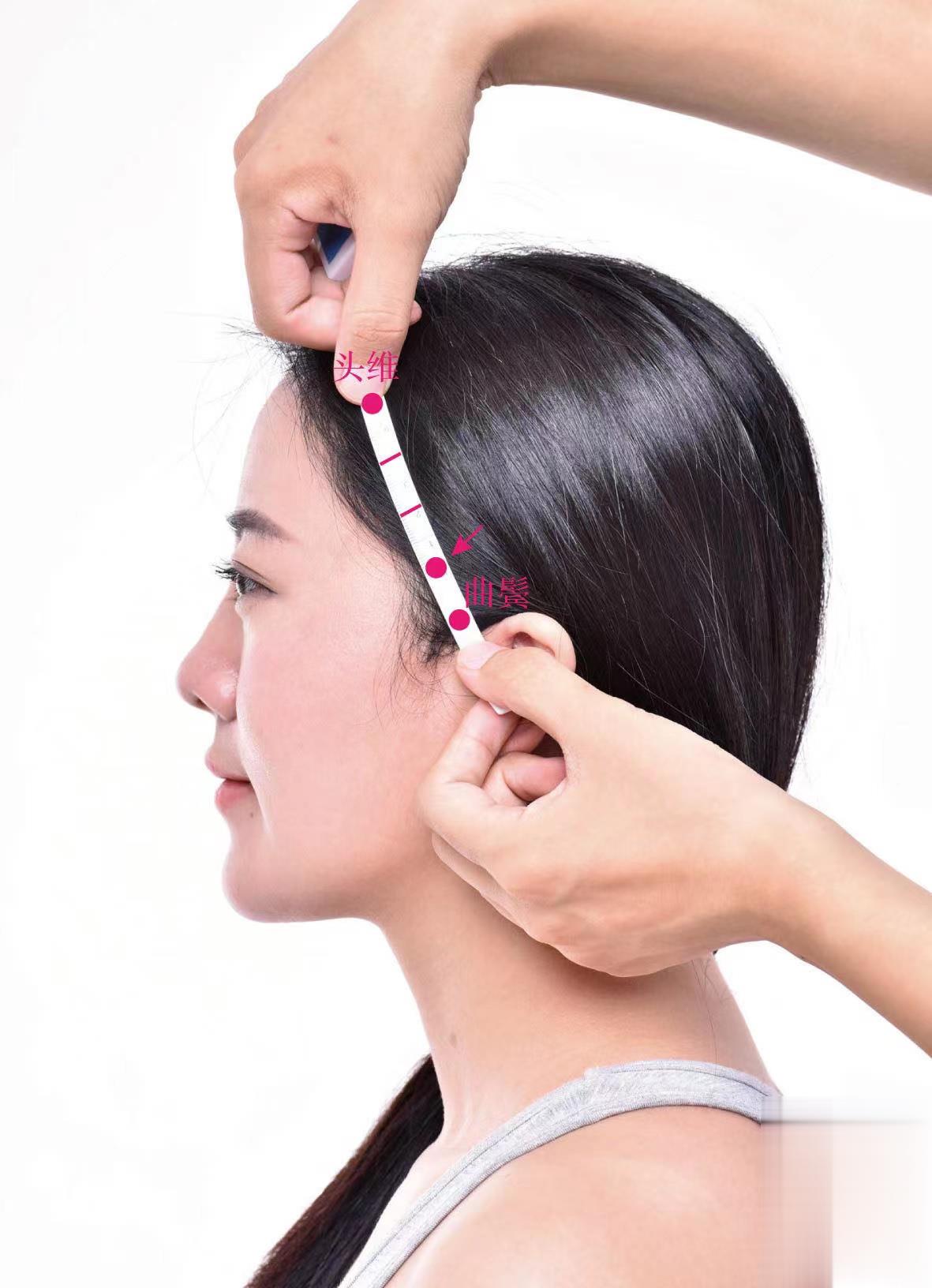 正坐或側(cè)伏坐位。先確定頭維穴和曲鬢穴的位置,取一-標(biāo)明四等分的彈性皮筋,拉長(zhǎng)皮筋,使其兩端點(diǎn)分別與頭維和曲鬢對(duì)應(yīng),在該皮筋上3/4與下1/4交點(diǎn)處即為此穴。