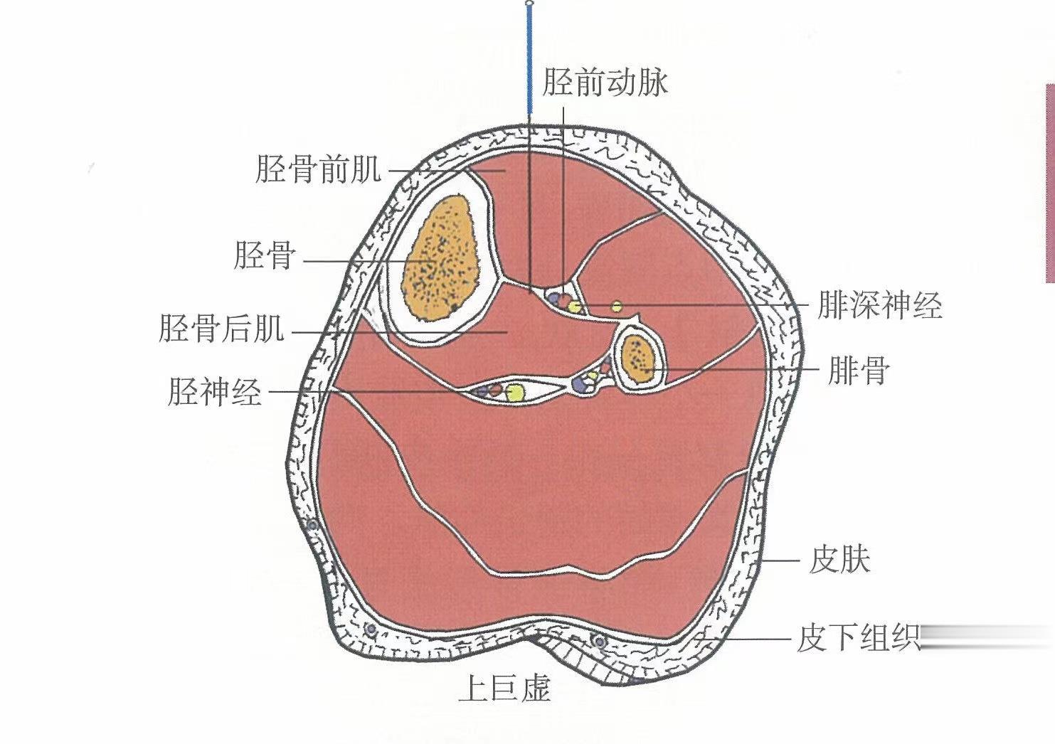 【解剖】在脛骨前肌中;有脛前動、靜脈;布有腓腸外側(cè)皮神經(jīng)及隱神經(jīng)的皮支,深層為腓深神經(jīng)。
