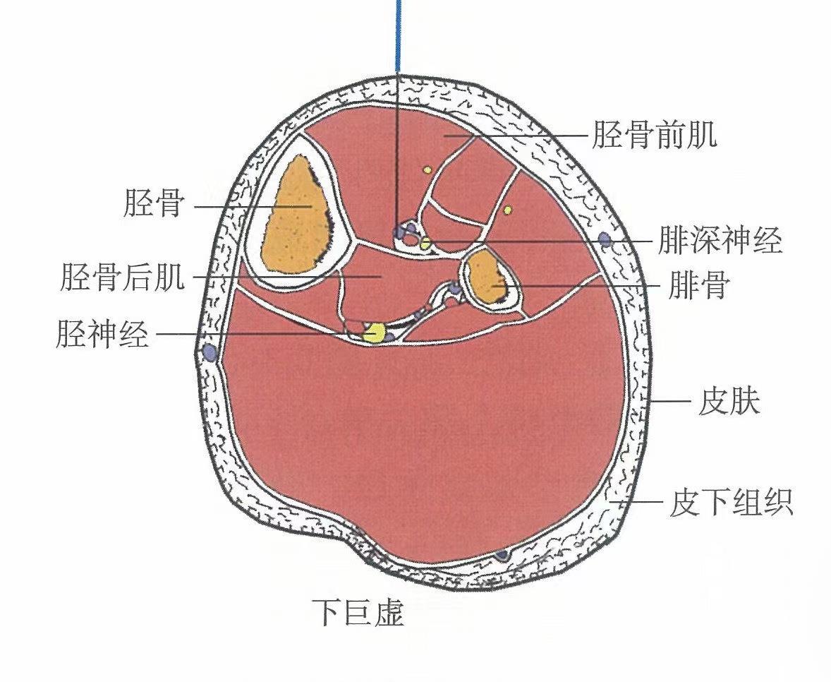 解剖:  皮膚→皮下組織→脛骨前肌→小腿骨間膜→脛骨后肌。淺層布有腓腸外側(cè)皮神經(jīng)。深層有脛前動(dòng)、靜脈和腓深神經(jīng)。