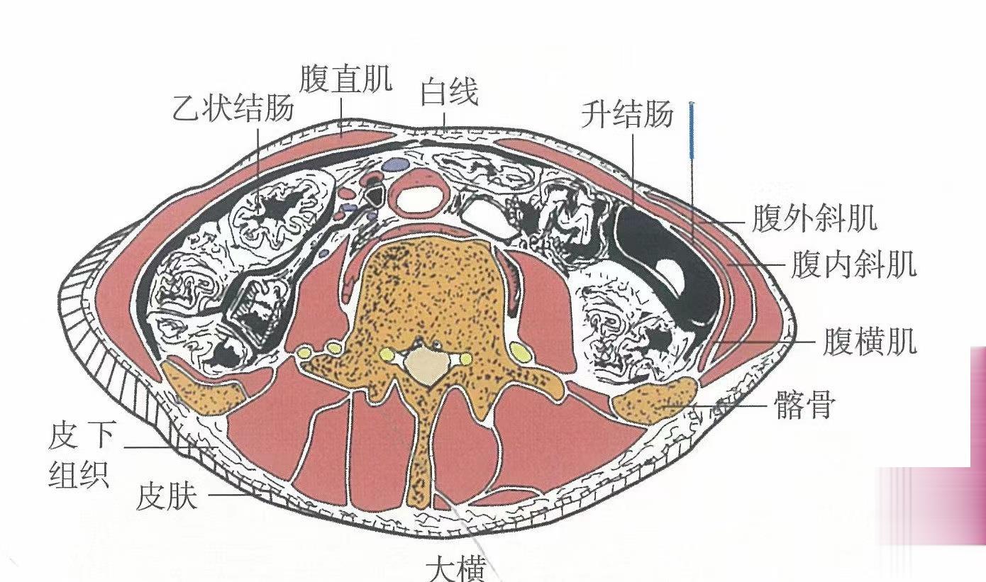 【解剖】皮膚→皮下組織→腹外斜肌→腹內(nèi)斜肌→腹橫肌。淺層布有第9、10、11胸神經(jīng)前支的外側(cè)皮支和胸腹壁靜脈的屬支。深層有第9、10、11胸神經(jīng)前支的肌支及伴行的動(dòng)、靜脈。