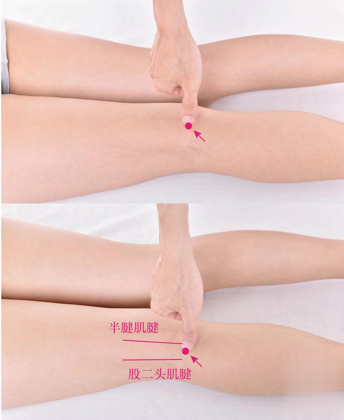 【取穴方法】膝蓋后面凹陷中央的腘橫紋中點(diǎn)即是。