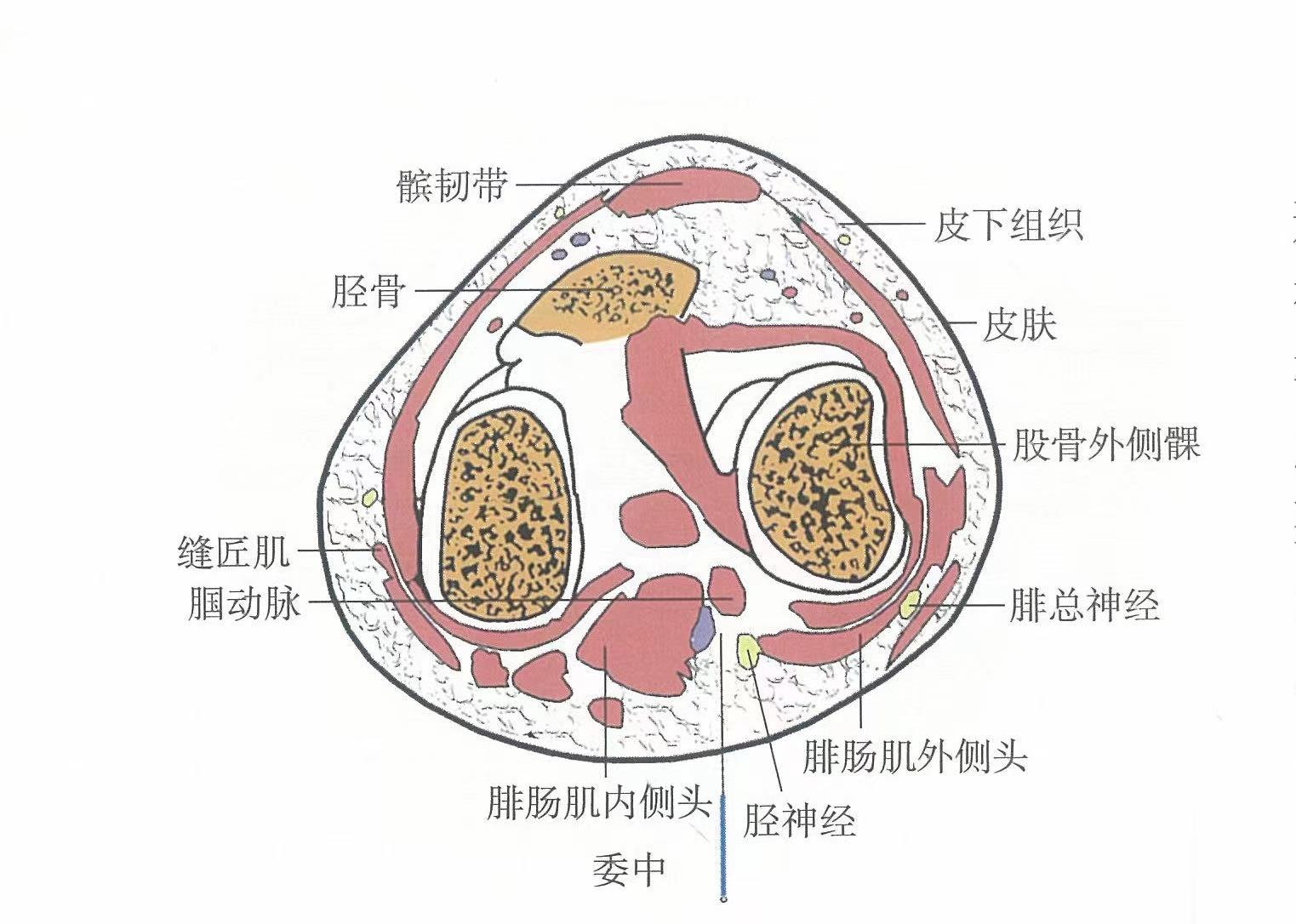 【解剖】在腘窩正中,有腘筋膜;皮下有股腘靜脈,深層內(nèi)側(cè)為腘靜脈,最深層為腘動(dòng)脈;分布有股后皮神經(jīng),正當(dāng)脛神經(jīng)處。