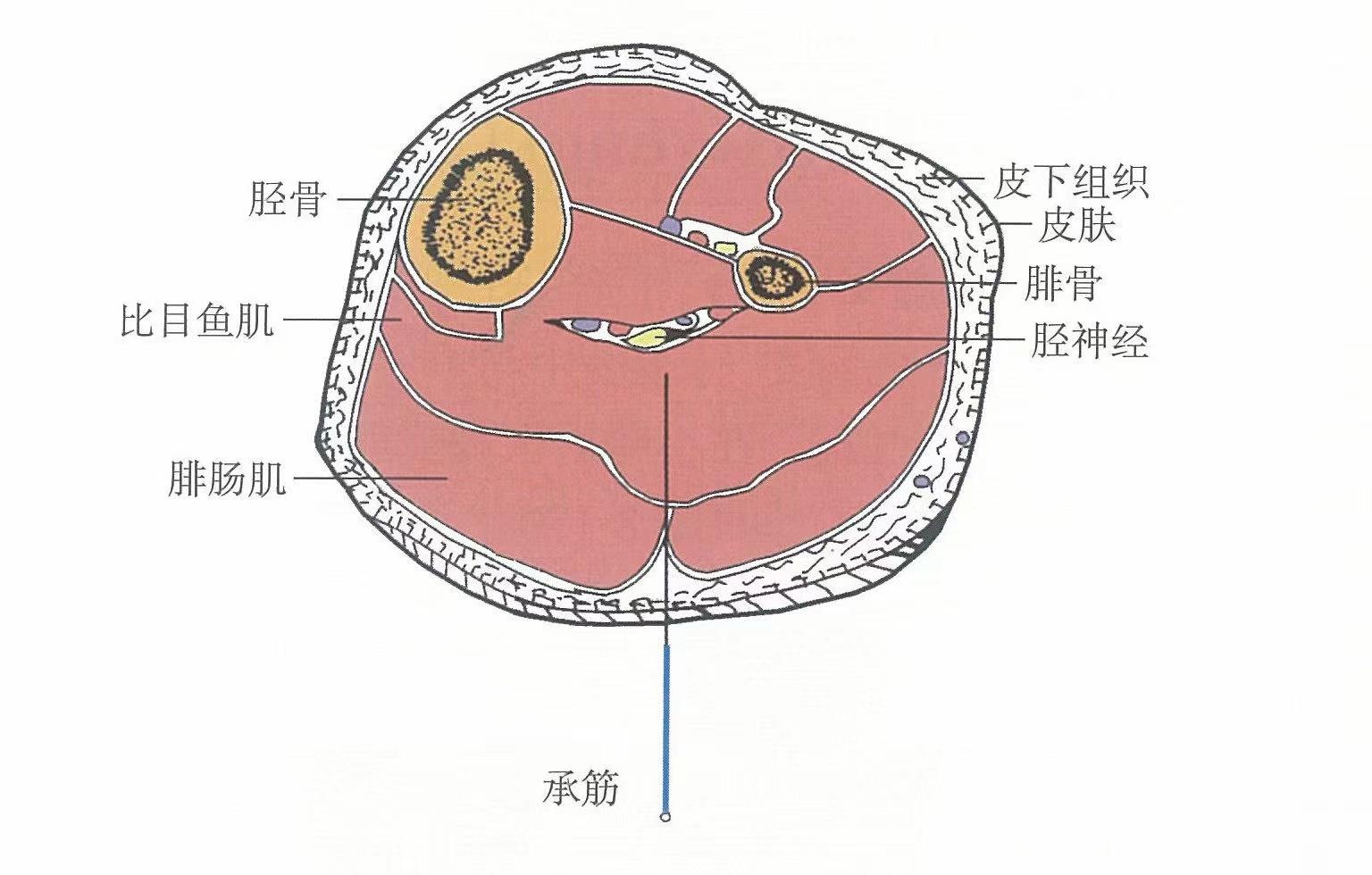 【解剖】在腓腸肌兩肌腹之間;有小隱靜脈,深層為腓后動、靜脈;布有腓腸內(nèi)側(cè)皮神經(jīng),深層為脛神經(jīng)。
