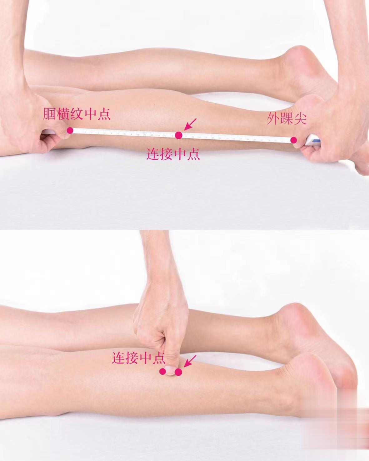 【取穴方法】正坐垂足,稍稍將膝蓋向內(nèi)傾斜,一手食中兩指并攏,其他手指彎曲,以食中兩指指腹順著跟腱外側(cè)的骨頭向上摸, 小腿肌肉的邊緣即是。