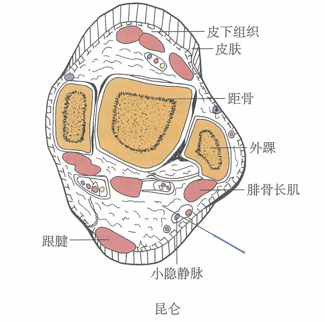 本穴首見于《靈樞•本輸》。昆侖,原為山名,意為高大,因穴在外踝之后,以其踝高突起如山,故名“昆侖”,別名“下昆侖”“內(nèi)昆侖”。