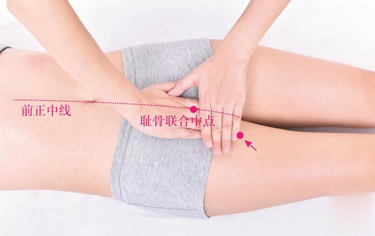 【位置】仰臥位伸足,先取曲骨穴旁開2寸處的氣沖穴,再于其直下3寸處取穴。