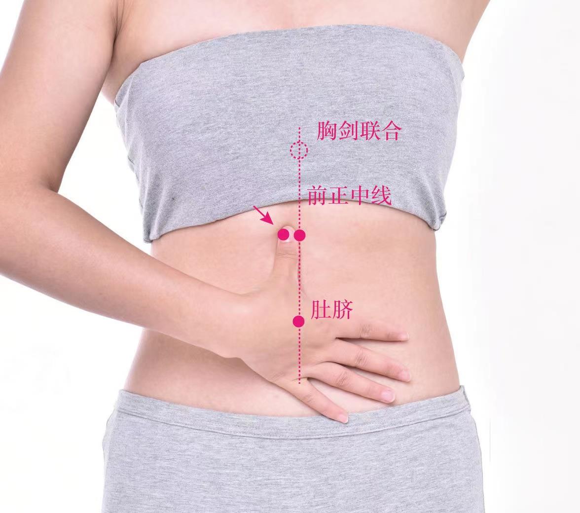 【取穴方法】在上腹部,臍中上4寸,前正中線旁開(kāi)0.5寸。劍胸聯(lián)合與肚臍連線中點(diǎn),再旁開(kāi)半橫指處即是該穴。