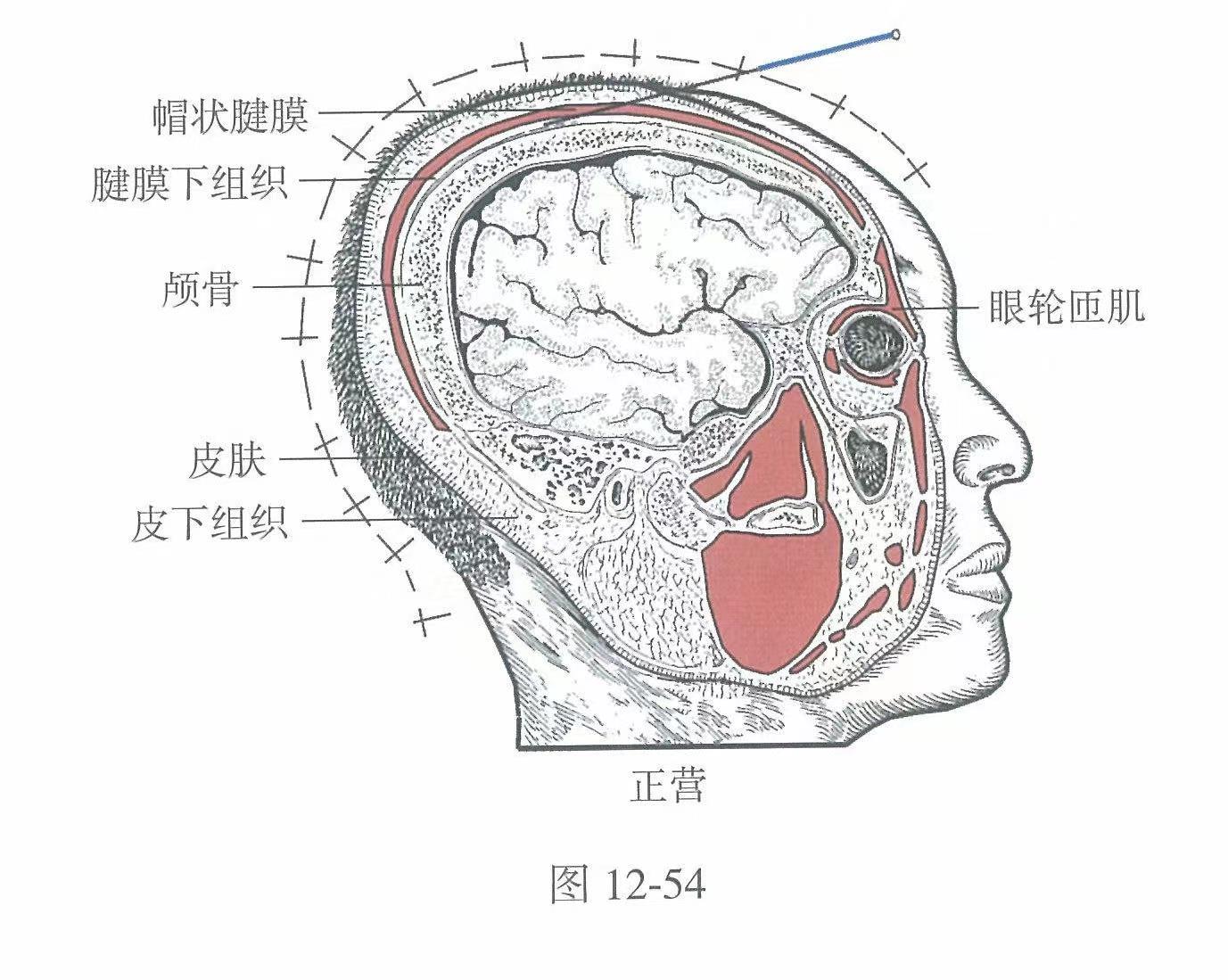 【解剖】在帽狀腱膜中;有顳淺動(dòng)、靜脈頂支和枕動(dòng)、靜脈吻合網(wǎng);布有額神經(jīng)和枕大神經(jīng)會(huì)合支。