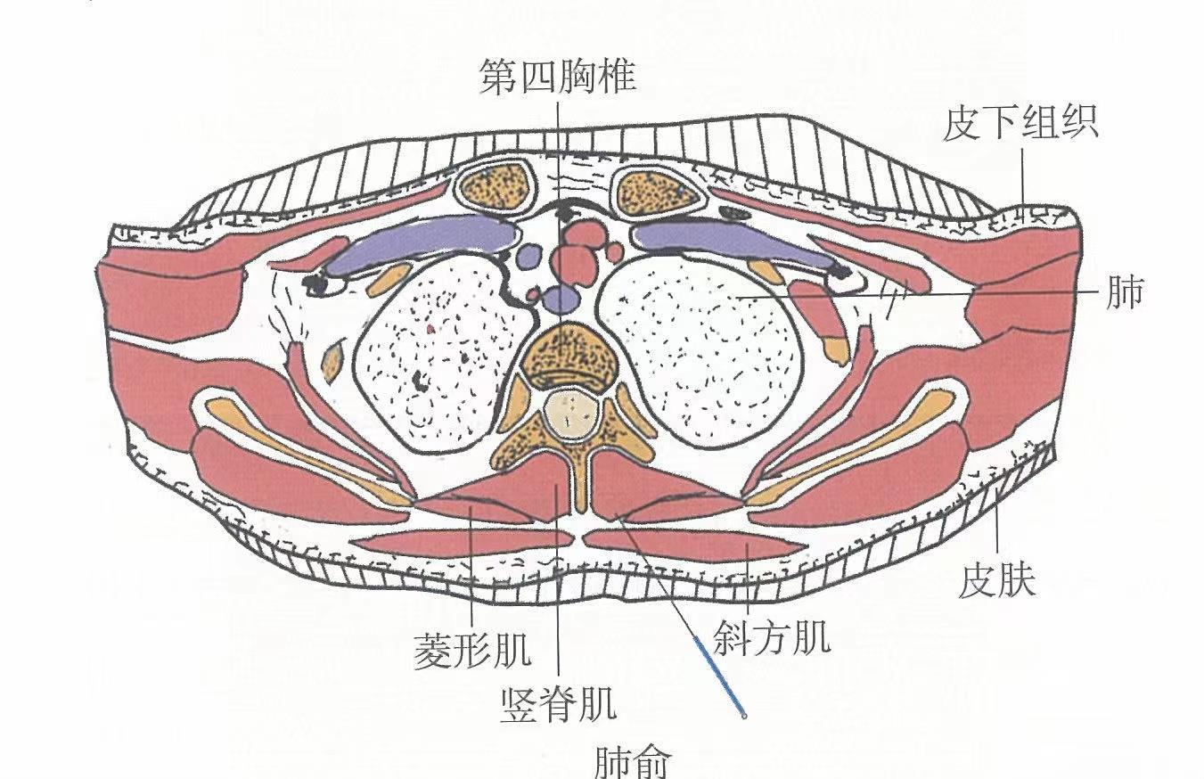 【解剖】有斜方肌、菱形肌,深層為最長肌;有第3、4肋間動、靜脈后支;布有第3、4胸神經(jīng)后支的內(nèi)側(cè)皮支,深層為第3、4胸神經(jīng)后支的肌支。