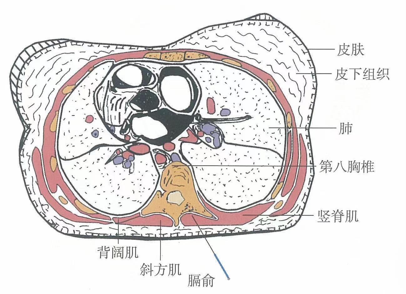 【解剖】皮膚→皮下組織→斜方肌→背闊肌→豎脊肌。淺層布有第7、8胸神經(jīng)后支的內(nèi)側(cè)皮支和伴行的動(dòng)、靜脈。深層有第7、8胸神經(jīng)后支的肌支和相應(yīng)肋間后動(dòng)、靜脈背側(cè)支的分支或?qū)僦А?br />