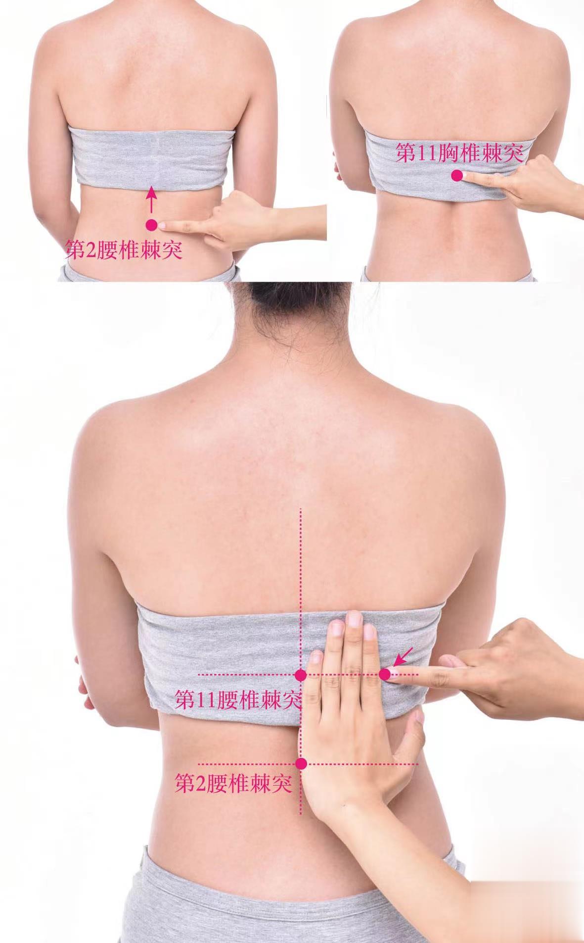 【取穴方法】俯臥位,平第十一胸椎棘突下,脊中(督脈)旁開3寸處取穴。