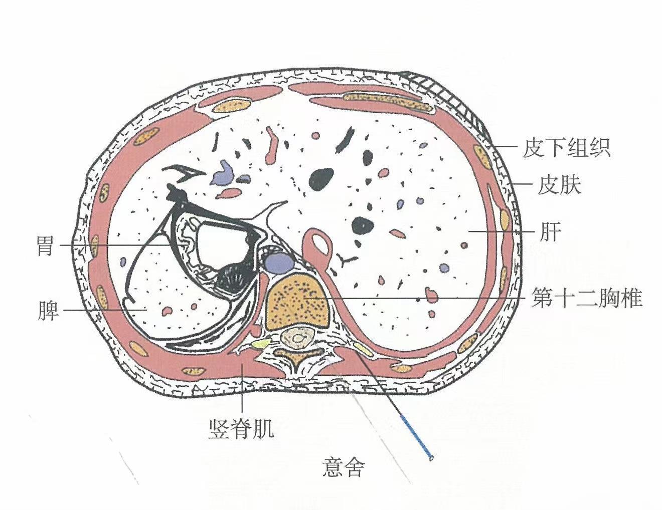 【解剖】皮膚→皮下組織→背闊肌→下后鋸肌→豎脊肌。淺層布有第10、11胸神經(jīng)后支的外側(cè)皮支和伴行的動、靜脈。深層有第10、11胸神經(jīng)后支的肌支和相應(yīng)的肋間后動、靜脈背側(cè)支的分支或?qū)僦А?br />